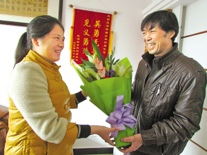 | 获救者黄追尚的女儿黄红儿给周长忠献上鲜花。(杨静雅 摄) |