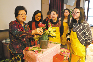 此次活动特地邀请了韩国插花专家金贞淑作专题培训,金贞淑曾为1988年汉城奥运会制作奖牌系列花束。一枝向日葵、一片三苏叶、几颗长青果、三两株美女樱……自然的花草,经过金女士的一番巧手侍弄,便焕发出另一种美丽。