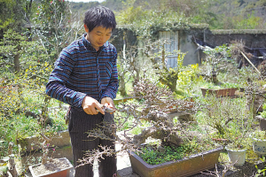 近日,宁海县胡陈乡长坑村盆景种植户王安夫正在修剪盆景,王安夫经营盆景已有24年,每年都有两三万元以上的盆景收入。该村建有“宁海县苔绿园艺专业合作社”和盆景协会,有40余户人家种植盆景,经营品种有榆树、梅树、紫藤等30余个,盆景为村民带来可观的经济收入。