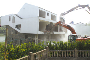 江 北 拆 除 五婆湖水库 违 建 别 墅 本报讯(刘平 吴红波 顾筠 徐欣)昨天下午,江北区对慈城镇五湖村五婆湖水库10号、11号、16号和17号地块内的违法建筑实施依法拆除,标志着五婆湖水库违建别墅依法拆除行动进入攻坚阶段。 据初步调查统计,五婆湖水库周边共有别墅21幢,分为18个地块,除15号地块为合法用地外,其余17个地块均为“两违”建筑,符合“三改一拆”范围。所有“两违”占地面积约1.2万平方米,建筑占地面积4000余平方米,其中涉嫌占用林地的有11个地块,涉嫌侵占水库水面及河流水面的有3个地块,涉嫌侵占耕地的有3个地块。 江北区有关负责人表示,这些违建当事人的行为涉及违反了《中华人民共和国土地管理法》、《中华人民共和国城乡规划法》、《中华人民共和国水法》、《国土资源行政处罚办法》、《浙江省实施土地管理法办法》、《浙江省林地管理办法》等相关法律法规。据了解,早在当事人实施违占违建行为之初,国土、农水等部门就已向当事人的违法行为作出了相应的监管措施,下发了“责令停止违法行为通知书”、“停工通知书”等。 为深入开展“三改一拆”和“五水共治”工作,改善城乡面貌、优化人居环境,江北区今年启动五婆湖水库违建别墅拆除工作。3月23日,该区对6号地块的4幢违建别墅依法实施强制拆除,拆除地块目前已清理完毕。 江北区昨天对10号、11号、16号和17号地块内的4幢违法建筑予以拆除。下午1时左右,工作人员进场清理物品,并登记造册,清运到指定场所存放。随后,工作人员指挥挖掘机对违法建筑开展拆除作业。违法建筑拆除完毕后,该区将组织力量对场地进行清理。 对五婆湖其他目前未拆除的违法建筑,江北区将在作出违法事实全面认定的基础上,依法予以拆除。 左图为拆违现场。