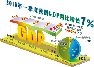 7%,备受关注的一季度中国经济增速15日对外公布。这一数字较去年四季度有所回落,但符合年初确定的增长目标。从开局数据中可以读出哪些讯息?对于经济运行中的新变化,下一步宏观政策将如何应对? “缓”中有亮点 “尽管一季度经济增速略有回落,但缓中有稳、缓中有新、缓中有进。”国家统计局新闻发言人盛来运在国新办发布会上这样描述第一季度经济运行的总体态势。 “稳”体现在主要指标仍处于合理区间。前三个月,我国经济7%的增长速度在国际范围内仍是较高水平,城镇新增就业320万、调查失业率在5.1%左右,物价低位平稳运行,全国居民人均可支配收入与GDP增长基本同步。 “进”是结构调整与转型升级在稳步推进。今年以来,我国经济结构由工业主导向服务型主导转型的趋势更趋明显,第三产业占GDP比重进一步提高至51.6%;在固定资产投资和出口增速回落的背景下,消费增长稳健,需求结构不断优化;经济增长质量效益提升,单位GDP能耗同比下降5.6%。 “新”体现在新产业、新业态、新主体、新动力正加快孕育,中国经济向中高端迈进的步伐明显。统计显示,在简政放权、扶持中小企业发展等措施影响下,一季度新登记注册企业数继续大幅增长,全国网上商品和服务零售额7607亿元,增速达41.3%。 重庆市经信委主任郭坚对新兴产业的巨大潜力深有体会,在互联网、信息技术的推动下,服务贸易等新产业突破了原有的地理区位限制,内陆与沿海有条件在同一起跑线上展开竞争。“一季度重庆跨境电子商务结算量已超过去年全年规模。”郭坚说。 短期压力仍大 尽管一季度国民经济运行总体平稳,但物价指数低位徘徊、工业生产增速回落、房地产市场继续调整等,都显示出短期内经济下行压力仍在加大。 以房地产市场为例。去年以来,国内房地产调控更加注重采取市场化、长效化方式,但各地楼市仍在分化调整。一季度,全国房地产开发投资同比名义增长8.5%,增速较去年同期大幅回落,房屋新开工面积、商品房销售面积、房企土地购置面积同比均有所下降。 在中国国际经济交流中心咨询研究部副部长王军看来,受制于国内人口结构的变化,房地产市场调整的幅度和持续时间或将超过预期,加上制造业去产能、去杠杆任务尚未完成,预计未来一段时间宏观经济仍将处于艰难探底的过程中。 增长与改革要平衡 王军认为,在这样的背景下,宏观政策要把握好增长和改革的平衡点,既要把经济增速稳定在合理区间,防止出现惯性下滑,为经济提质增效打下基础,又要着眼长远,坚持通过深化改革的办法释放经济发展潜力,注重发挥改革的增长效应,把那些有利于稳增长、调结构、促转型的改革放在优先位置。 “从需求角度看,有效投资对于稳住经济仍很重要。”经济学家张其佐分析说,一季度固定资产投资增速显著回落是经济放缓的主要原因,下一步要在解决投资质量、效率与方向的前提下,更好地发挥投资的关键作用。 国家行政学院研究员胡敏表示,从目前已公布的经济指标来看,此前陆续出台的结构性调控措施,在应对经济下行压力方面已经发挥了一定的作用。未来财政政策要加力增效,货币政策则要在延续稳健总基调的前提下,更加强调松紧适度,并通过优化信贷结构等举措,引导更多金融活水流向实体经济和新兴产业。 7% GDP增速符合预期 国家统计局15日公布的数据显示,2015年一季度我国GDP同比增长7%。7%的增速在市场预期之中。国际评级机构惠誉亚太区主权评级主管高翰德表示,“中国一季度经济增速放缓,不应被视为坏消息,因为中国的经济增长正在调整到更可持续的水平,这种调整需要从粗放式的投资拉动转型到消费驱动。”专家认为,在全球经济深度调整和中国经济发展进入新常态的大背景下,一季度7%的GDP增速仍保持在合理区间,这也显示了中国经济砥砺前行的韧性。 8.1% 居民收入“跑赢”GDP 国家统计局15日公布的一季度经济数据显示,一季度全国居民人均可支配收入6087元,同比名义增长9.4%,扣除价格因素实际增长8.1%,增幅超过7%的GDP增速。其中,城镇居民人均可支配收入8572元,扣除价格因素实际增长7.0%;农村居民人均可支配收入3279元,扣除价格因素实际增长8.9%。全国居民人均可支配收入中位数5216元,同比名义增长11.1%。城乡居民收入差距进一步缩小,收入分配结构持续改善。 51.6% 第三产业比重上升 虽然中国经济增速继续放缓,但产业结构更趋优化。国家统计局15日公布的一季度经济数据显示,一季度第三产业增加值占国内生产总值的比重为51.6%,比上年同期提高1.8个百分点,高于第二产业8.7个百分点。 国家统计局新闻发言人盛来运说,服务业增加值占GDP的比重从2013年的46.9%,上升至2014年的48.2%,到一季度的51.6%,说明我国经济结构由工业主导向服务型主导转型的趋势更加明显。 数据还显示,一季度,高技术产业增加值同比增长11.4%,装备制造业增长7.7%,增速分别比规模以上工业快5.0个百分点和1.3个百分点,工业内部创新升级步伐加快。 ●GDP结构向好 ●货币政策调整加速●房地产二季度上行可期●消费增长步入转换期 数据显示,一季度GDP结构向好,第三产业增加值占GDP的比重为51.6%,比上年同期提高1.8个百分点,高于第二产业8.7个百分点。工业内部创新升级步伐加快,城乡居民收入差距进一步缩小,节能降耗继续取得新进展,一季度单位GDP能耗同比下降5.6%。 