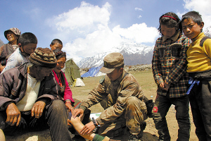 5月2日,西藏绒辖乡居民在受损程度相对较小的陈塘村接受解放军西藏军区部队卫生员的治疗。