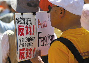 | 5月3日,在日本横滨,示威者手持“反对秘密保护法,反对集体自卫权”的标语,抗议首相安倍晋三企图修改和平宪法。 (新华社记者 刘天 摄) |