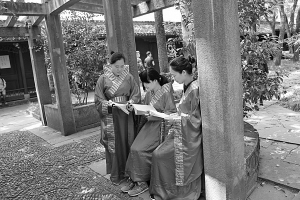 在汉服情景秀活动中,天一阁里再现了一群身着汉服的“古人”在南园古阁前持卷读书,花坞水边观鱼,曲筝与水袖相映成趣的场景。游客和市民朋友纷纷拿起相机拍下这书香园雅的一幕,还有些游客与“古人”合影留念。