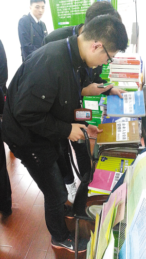 图为执法人员在检查教材的真伪。 (记者 余建文 摄) |