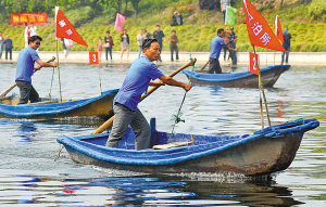 昨天下午,奉化市莼湖镇渔民正在降渚溪进行舢板船划船比赛。当天,莼湖镇第3届“蓝海莼湖”休闲养生文化节暨第5届农渔民运动会开幕,近千名农渔民参加了划桨、织网、划泥船、海上拔河等传统运动项目。