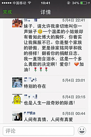 全国上百万白血病患者在苦苦等待 1月21日,中华骨髓库支援捐献者情况通报会在京召开。据统计,截至2014年12月,中华骨髓库已经入库的志愿捐献者资料达到200万人份,位列美国、德国、巴西之后,排名世界第四;累计捐献造血干细胞4690多例,10年间累计向其他国家和地区的183名患者捐献了造血干细胞。 解放军第307医院移植科主任陈虎教授介绍,200万份库容量还远远不够,目前中国白血病患病率在6/10万,每年还新增7万名白血病患者,其中绝大部分为儿童。上百万名需要移植造血干细胞的白血病患儿在苦苦等待配型成功,库容量如果达到600万份,才算得上比较“理想”。 这两天,甬城网友的微博、微信朋友圈里流传着这样一个感人的故事:为了救助一个陌生人,宁波江东区28岁的陈妍特意推迟了怀孕,捐赠造血干细胞。她的事迹,感动了我们这座城市,也随着互联网传到全国各地,在网上引发强烈反响。昨天,完成了造血干细胞捐献已从杭州回来的陈妍说:“在茫茫人海中,我能挽救一个人的生命,是缘分,是幸运。” 今天恰是第68个世界红十字日,我们的社会需要更多陈妍这样的人,让生命延续,让爱心传递——— 陈妍捐献造血干细胞的故事感动一座城市 □本报记者 朱军备 王 珏 通讯员 杨 磊 杨晓丽 红会工作人员网上分享感人细节 “她的勇敢和大爱令我动容” 江东区红十字会工作人员赵蔚陪同陈妍一起前往省中医院,见证并记录了陈妍完成造血干细胞的捐献全过程。回想这几天的经历,很多小细节让她感动。她在微信朋友圈里分享了这些细节,一句发自内心的感受“她的勇敢和大爱令我动容”,引发很多网友的共鸣。 4月29日,出发去杭州的前一天,赵蔚和陈妍在QQ上交流,谈到将来生宝宝的问题,陈妍并不是没有担心:“捐献前后,身体备孕情况可能就不一样了。但如果我不去,心里肯定一直郁闷着,那就更难受了。做好事还是会让人心情愉悦的,而且去捐献之后,心里安定了,我就可以更加安心地去调理身体备孕啦。” 4月30日上午9时,赵蔚和陈妍坐上一辆商务车,一起前往杭州。 在省中医院的那5天时间里,与陈妍吃住在一起,有好多细节令她感动:“到杭州的时候,我问陈妍想不想见到那位受你帮助的病人?她说,既想又不想。想,是想知道她是一个什么样的人;不想,是因为害怕,害怕她不能完全康复……5月4日,在正式开始捐献前,我握着她的手问她害不害怕?她说,到现在为止,我想的就只是希望这次真的能帮到她,盼对方能好起来。” “她是一个爱美的姑娘,捐献的时候需要拍照,她就立马要先检查自己的发型,让我替她理理头发,坚持要把美好、阳光的形象留给大家。她,也是一个勇敢的‘女神’,针管很粗而血管太细,左右两只胳膊都挨了针扎,原本怕疼的她硬是忍住了。”赵蔚发自肺腑地赞赏这个美丽又坚强的女性。 陈妍微信朋友圈收获祝福和鼓励 “看到左右胳膊都是针头,再次感叹你的勇敢!” 5月4日,省红十字会工作人员拿来了专门用于运送干细胞的盒子,打开空盒,里面是受捐者托红十字会工作人员带来的一条铂金项链、一封感谢信和一个祝福卡片。陈妍的先生把信拿出来,给正在输血的陈妍看——— “亲: 茫茫人海中,你我相遇、碰撞的概率是多么渺小!又是多么地幸运,才有这种机会,对吧!我对你充满了太多的感情,神秘、好奇、希望…… 等待重生的日子既恐惧又痛苦。自从生病以来,感觉自己陷入黑洞,这几个月来,感谢那么多的好心人。不幸的我,接受命运的安排,每个人都会有属于自己的风景,在医院认识了很多的“战友”,我们互相打气,加油,还有很多小伙伴在等待骨髓,你们这些骨髓捐献者对我们来说就是天使,是希望!神圣的你该是抱着怎样的心情去捐赠? 一直以来不够勇敢的我,希望能被你的勇气所带动,毫无畏惧地走进移植室,为自己的生命而战。也希望我尽快康复,能给这个世界带来更多的正能量。把你传递的爱带给更多的人,向你的高尚看齐,感谢你给我一次重生的机会,我会带着你的血液更加去珍惜生命中的每一次感动。 我相信命运会是公平的,想要最好的,必须承受最痛的。这一段患病的经历中,我一直在努力抗争,坚信“小白”会被我打败,感谢你的一切。千言万语尽在不言中,希望有缘的我们会在未来某个街角遇到,微笑以对也许是最好的方式。 陈妍说:“看了感谢信后,我突然一下子很感动,才真真切切地感觉到自己当初的决定非常正确。每看一遍,心里感动、感慨就加深一份。” 然后,陈妍把这份感动分享在自己的朋友圈:“妹子,谢谢你带给我的感动,他们说,受者接受供者的造血干细胞之后,血型会变得跟供者一样,性格可能也会跟供者一样,而且红会人员告诉我,我俩高配百分百一致!我相信,我们一定出于同宗,很高兴能帮助你,我未曾见面的妹妹……愿你一切顺利,早日康复!” 从4月30日出发去杭州开始,陈妍就在微信朋友圈记录自己捐献过程中的点点滴滴,结果得到众多好友的称赞: “勇敢善良的好姐妹,一切顺利哦!我们一直关注你!” “你不是一个人在战斗,加油!” “看到左右胳膊都是针头,再一次感叹你的勇敢!” “一个温柔的小姑娘却有着如此博大的胸怀,你着实让我佩服不已。你是整个家族的骄傲,是我们的榜样!翻看你的捐献日志,我一直饱含泪水,这是一个多么勇敢的决定啊!” 她给这座城市带来的感动在持续升温 “你的善良温暖了这个世界