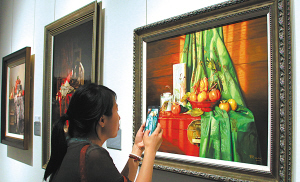 图为市民在观赏曹辉油画艺术展。 (记者 周建平 摄) |