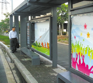 玻璃碎裂的公交车站。(记者 余建文 摄) |