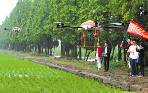 昨天,在江北区庄桥街道费市村禾苗地上,宁波市供销社甬丰农资公司农技手正在演示无人机喷洒农药。为引导种植大户转变农机具新观念,当天,该农资公司首期无人植保机操作与培训展开,来自各县(市)区植保专业合作社的18名学员将接受为期7天的免费操作培训。据介绍,该无人机一天可以为300亩农田喷药,比人工施药效率提高了10倍以上。 (胡建华 吴红波 摄)