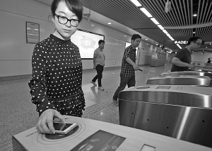 市民正在地铁东环南路站使用手机市民卡乘坐地铁。(徐文杰 摄) |