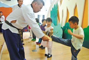 “六一”儿童节来临之际,昨天上午,鄞州金宁社区请来老师教辖区的孩子练习跆拳道。瞧,在老师的指导下,孩子们的一招一式有模有样,陪同的家长开心不已。