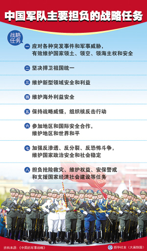 中国最新的军事战略是什么?制定的依据在哪里?它将怎样影响中国军队未来发展?国务院新闻办公室26日发表《中国的军事战略》,军事科学院的军事专家们对这部白皮书中的十个亮点进行了解读。 亮点一:“四个维护”成为中国军队新使命 白皮书说,“中国军队有效履行新的历史时期军队使命,坚决维护中国共产党的领导和中国特色社会主义制度,坚决维护国家主权、安全、发展利益,坚决维护国家发展的重要战略机遇期,坚决维护地区与世界和平,为全面建成小康社会、实现中华民族伟大复兴提供坚强保障。” 军事战略部研究员赵德喜:军队使命是指军队在一个较长的历史时期内所承担的重大职责和基本任务。随着时代发展和国家安全环境的变化,我军的职能使命不断拓展,“四个维护”为推进军队建设和军事斗争准备提供了基本遵循。这是我们党对我军历史使命认识的新境界新高度,也要求全军统一思想、凝聚共识,紧紧围绕有效履行这一使命展开全部工作。 亮点二:中国军队八项战略任务 白皮书说,“中国军队主要担负以下战略任务:应对各种突发事件和军事威胁,有效维护国家领土、领空、领海主权和安全;坚决捍卫祖国统一;维护新型领域安全和利益;维护海外利益安全;保持战略威慑,组织核反击行动;参加地区和国际安全合作,维护地区和世界和平;加强反渗透、反分裂、反恐怖斗争,维护国家政治安全和社会稳定;担负抢险救灾、维护权益、安保警戒和支援国家经济社会建设等任务。” 国防政策研究中心研究员温冰:关于军队的任务,过去我们一般用“总任务”“总目标”等表述方式来作出要求。这部白皮书第一次明确了军队的8项战略任务,涵盖了传统安全和非传统安全领域,还涉及太空、网络等新型安全领域。这些任务是新的历史时期军队使命的具体体现,将对全军的建设发展起到具体的指引作用。 亮点三:“毫不动摇坚持积极防御战略思想” 白皮书说,“积极防御战略思想是中国共产党军事战略思想的基本点。在长期革命战争实践中,人民军队形成了一整套积极防御战略思想,坚持战略上防御与战役战斗上进攻的统一,坚持防御、自卫、后发制人的原则,坚持‘人不犯我,我不犯人;人若犯我,我必犯人’。” “中国必须毫不动摇坚持积极防御战略思想,同时不断丰富和发展这一思想的内涵。” 国防政策研究中心主任陈舟:“积极防御”的本质是“防御”,要义在“积极”。长期以来,正是基于坚持这一战略思想的坚定性、稳定性和连续性,坚决不搞侵略扩张,不称霸,不争霸,我国才赢得了相对和平稳定的国际环境,赢得了国家发展的重要战略机遇期。中国再强大,也不会放弃和平发展的国家战略,不会背离积极防御战略思想的本质,不会违背时代潮流走上武力扩张之路。 亮点四:“将军事斗争准备基点放在打赢信息化局部战争上” 白皮书说,“实行新形势下积极防御军事战略方针,调整军事斗争准备基点。根据战争形态演变和国家安全形势,将军事斗争准备基点放在打赢信息化局部战争上,突出海上军事斗争和军事斗争准备,有效控制重大危机,妥善应对连锁反应,坚决捍卫国家领土主权、统一和安全。” 国防政策研究中心研究员闫文虎:军事斗争准备基点由此前的“打赢信息化条件下的局部战争”调整为“打赢信息化局部战争”,虽然只少了4个字,内涵却有质的飞跃。当前,世界新军事革命深入发展,武器装备远程精确化、智能化、隐身化、无人化趋势明显,太空和网络空间成为各方战略竞争新的制高点,战争形态加速向信息化战争演变。战争的制胜机理已经改变,我们的军事斗争准备立足点当然也要随之调整。 亮点五:“海上方向维权斗争将长期存在” 白皮书说,“在可预见的未来,世界大战打不起来。” “作为一个发展中大国,中国仍然面临多元复杂的安全威胁。” “个别海上邻国在涉及中国领土主权和海洋权益问题上采取挑衅性举动,在非法‘占据’的中方岛礁上加强军事存在。一些域外国家也极力插手南海事务,个别国家对华保持高频度海空抵近侦察,海上方向维权斗争将长期存在。” 国防政策研究中心研究员于淼:正确判断国际战略形势和国家安全环境,是谋划制定军事战略的首要前提。中国面临的内外部风险挑战,涉及大国因素、领土主权和海洋权益争端等方方面面。在相互利益高度依存的今天,地区任何一个地方生乱甚至生战,都会对各方的长远利益造成损害。因此,中国对维护和促进地区安全稳定的意愿是强烈的,对可能严重冲击我国发展重要机遇期的风险是高度警惕的。 亮点六:首提“海外利益攸关区” 白皮书说,“加强海外利益攸关区国际安全合作,维护海外利益安全。” 国防政策研究中心研究员李煜:我国首次在国防白皮书中明确提出“海外利益攸关区”概念,这表明,随着中国国家利益的拓展,维护海外利益安全已经成为军事战略高度关注的重要问题。这是全球化时代保障国家可持续发展的需要,也有利于维护世界和地区安全稳定。 亮点七:首次公布海军战略转型 白皮书说,“海军按照近海防御、远海护卫的战略要求,逐步实现近海防御型向近海防御与远海护卫型结合转变,构建合成、多能、高效的海上作战力量体系,提高战略威慑与反击、海上机动作战、海上联合作战、综合防御作战和综合保障能力。” 军事战略部