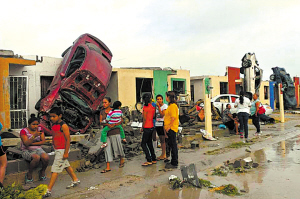 5月25日,在墨西哥北部边境城市阿库尼亚,当地民众站在遭龙卷风袭击后一片狼藉的街道上。(新华社发) |