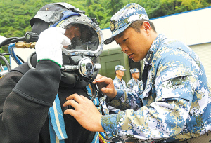 李凯帮战友检查潜水装备。 (王红雨 徐欣 摄) |