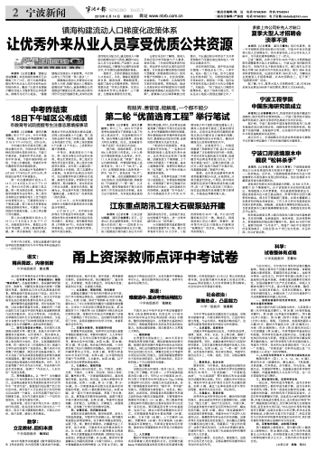 中考于昨日结束。本报记者邀请宁波外国语学校的资深教师对今年中考各学科试卷进行一一点评分析。 语文: 精兵简政,内容创新 中学高级教师 徐文霄 2015语文中考卷的设计非常大胆而创新。 一、在积累与运用中(即基础部分)继续“精兵简政”。在基础考察中,坚决摒弃辨析错别字、改病句、判断标点等这些内容单一而繁琐的考查,强调突出古诗文和名著阅读的积累。精简基础内容表达出如下理念:语文学习的重点不是做习题,而是看书;语文水平的提高首先会在阅读的积累和思考中去实现。 摒弃繁琐的基础题考查,同时也是放下包袱,让语文教学更富有生机。该板块另一个亮点是把文言文基本字词的考查从阅读移到积累与运用的板块里,而且只考实词,不涉虚词。此举既符合初中生文言阅读的认知现状,又是对文言教学中过于纠结虚词现象的对症下药,避免文言文字词解释上过细过死的倾向。 二、现代文阅读设计精妙。本次现代文阅读部分居然只考一篇文章,但是文本内容与考察要求丰富多样。从作者简介,到文章本身,再到涉及该文章的一些评价,对阅读文本的呈现上是全面而立体的。其次,从阅读题型排列来看,把一般性文本(非连续性文本)阅读与文学作品的阅读作了有效结合。整个系列不仅考察了学生概括、原因分析这些基本能力,同时又具备了语句品味到思想感悟这样较为高级的阅读要求。整个题目系列有效并且有序,科学地呈现出阅读能力的阶梯延伸。另外,本文注重考察了学生对作品与作家、作品风格与作品生活的联系,强调了“作品如人,人如生活”的指导思想。 三、写作别具匠心。以“种子”为关键词设计出三个有所联系而又有各自拓展方向的题目。这表明出题者首先考虑到的是学生们在写作中“有话可说”,鼓励他们说出属于自己的生活内容。然后每个人可以结合自己的写作特长自由选择一个题目,从而写出属于他们自己的精彩文章。本次作文题目坚持了一个写作价值取向:文章首先要有内容。 纵览本卷,结合宁波中考几年来一直努力前行的过程,给关注语文和学习语文的人一个提示:语文不是习题堆砌的模具,它是认识生活、提升思维、感悟心灵的载体。 数学: 立足教材,回归本质 中学高级教师 鲍雨红 2015中考数学试卷遵循《数学课程标准》和《考试说明》的内容范围与要求进行命题。本着面向全体、稳中求变、变中求新、两考兼顾的原则。试卷结构合理,知识覆盖面广,重点突出,具有梯度,难易比例适当,有很高的信度、效度和区分度,注重能力考查。 一、立足教材,围绕考纲,导向教学 试题基本覆盖了所有的初中数学必学内容,四个学习领域比例恰当。试题背景让学生很容易切入。如第12题,取材于考纲第43页第12题,题中加入了中心对称图形的概念与原题和谐地整合,让学生十分亲切但又需要灵活应变。第24题取材于八下教材第103页课题学习格点多边形的面积计算,将教材中的亮点内容搬到了试卷上,无疑增加了学生的信心,这对教师的教学指明了方向,讲清讲透教材中的学习内容,有着积极的导向作用。 二、注重生活数学,体现数学价值 积累数学活动经验、培养学生应用意识是数学课程的重要目标。学数学用数学,人人学有价值的数学。引导学生用数学的眼光去观察、思考、解决生活中的问题。如第16题、第20题、第21题、第22题。结合地方特色命题,十分自然实现了知识与情景的有效整合,较好地体现了问题背景的公平性。如第3题,背景内容是2015年具有时代感。如第4题,以中国传统佳节端午节为背景,人文数学。如第22题,以宁波火车站为背景体现地域性。 三、凸显核心,重视四基 突出核心知识的地位,如:代数式、函数、方程、不等式、三角形、四边形、相似三角形、圆、概率统计等。一方面重视基础知识,基本技能的考查,起点低,易完成,让绝大多数学生享有成功感。如第1-10题;第13-17题;第19-24题。另一方面重视基本思想方法及基本活动经验的考查。如第11题的数形结合法;如第24题,是一道半开放的改编题,考查了学生想、画、选、算等基本的数学活动经验,是源于课本并高于课本的好题。如第25题,考查学生阅读理解、分析能力、证明能力、计算能力、画图能力等,还考察了分类讨论的数学思想。 四、去繁存真,回归数学本质 试卷的语言通俗简明,数学味浓厚,没有人为制造阅读量,平稳学生的审题心态。填空题的难度较以前明显降低。对计算的考察全面到位,去除了怪、难、繁的计算要求。在解题方法上不求奇,也不求特,只要求学生运用最本质的方法。如18题、25题的第3小题考察反比例函数,学生只要掌握基本的两条路(面积法与设点坐标法)即能迎刃而解。如26题,要求学生掌握解决几何题的两条路(勾股与相似),在相似中掌握最基本的两种模型(A字型X字型)。题海战术不再是应试法宝,反思在教学中要教会学生什么,要关注数学知识的本质,培养学生基本的思维方式。 英语: 难度适中,重点考查运用能力 中学高级教师 张姬红 宁波市2015年初中英语中考试卷遵循并落实《英语课程标准》的理念和《宁波市2015年初中毕业生学业考试说明·英语》的要求。整份试卷难度适中,在考查学生基础知识的同时,更侧重考查学生实际运用英语的综合能力,体现出题型新颖、能力彰显和人文厚重三大特色。 一、题型新颖 在考查学生语法能力