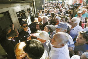 | |  |  | 7月1日,在希腊首都雅典一家国有银行外,退休的老人们等待领取养老金。 因资本管制而暂停对外营业的希腊银行当天仅对养老金领取者开放。每名退休人员最多可以领取120欧元现金。6月30日晚,欧洲金融稳定机构发表声明说,希腊现有的救助协议于当夜12点到期,希腊将无法得到该协议尚未发放的18亿欧元贷款。