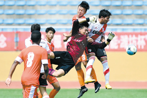 7月29日,鲁能DB联队守门员高鸣扬(右三)在比赛中扑救。