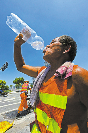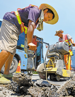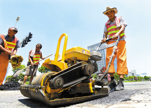 室外气温35℃,地表温度接近50℃。昨天中午11时许,鄞州区宁南南路与泰康中路路口,一群养护工正在修补一处1平方米左右的破损路面。 “气温越高,沥青黏合性就越好,路面修补效果也更理想。”现场负责人吕工程师说,此刻恰是他们修补路面的“黄金时间”。前段时间的几场强降雨造成该区道路多处出现裂缝、坑洞,为尽快消除隐患,确保修补质量,鄞州区城管局在加强劳动保护的同时,派出2组人马抓住时机连续进行突击抢修。 (徐 能 朱娇娇 摄/文) 工人正用电锤清理破损路面。 工人利用电动平板夯进行路面沥青烫铺作业。 来自江苏徐州的陈乃福师傅正在喝水补充水分。