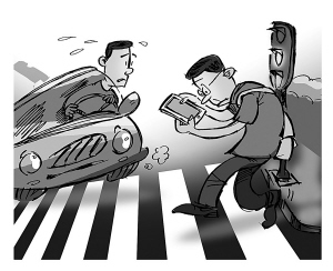 行人刷着手机闯红灯 现在,“手不离机”的人随处可见。开车时刷手机,低头2秒,车辆盲驶30米,危害可想而知。相对应的,行人低头忙着刷手机,容易忽视交通规则,不知不觉中闯了红灯,或者导致车辆驾驶员误判,最终引发悲剧。 “低头族”闯红灯被撞 前不久,江北发生了一起交通事故。晚上7时40分许,在文教路与范江岸路路口,有位司机看到前方绿灯亮起,就踩了一脚油门前行。就在这时,司机突然发现前面人行横道上有个人低着头走了出来,他急忙踩刹车减速,但距离太近了,还是撞上了。 交警现场调查发现,这是一起由行人闯红灯引发的交通事故。据伤者小王介绍,当时他来到这个路口准备过马路,发现前面是红灯就停了下来。这时他身边还停着一辆电动自行车,他就把这辆电动自行车当成了绿灯的“提醒标志”,于是掏出手机开始刷微信。之后电动自行车闯红灯前行,小王头也没抬,以为已经是绿灯了,便跟着过马路,最后被车辆给撞得左腿大腿骨骨折。 “‘低头族’逐渐成为道路交通安全新隐患。”交警说,随着手机功能日益丰富,不少行人是捧着手机走路,以此来打发赶路时间。殊不知,本来应该用在观察路面交通情况的双眼放到了手机屏幕上,危险来了也没知觉,甚至是在不知不觉中制造危险。 刷手机过马路年轻人多 “低头族”过马路的情况到底有多严重?日前,记者选择了几个路口进行观察,发现年轻人居多。 在灵桥西路口,以一个灯次为限,记者清点了一下,20多人过马路,其中7人有使用手机的行为。在江厦桥东路口,9人过马路,2人在刷手机。在鄞州万达广场前方的四明路上,一个灯次17人中有7人低头刷手机。记者还发现,没有红绿灯的人行横道,过马路的“低头族”少之又少,显然,那些“低头族”知道没红绿灯低头过马路危险。 调查中发现,独行的年轻人过马路时最容易成为“低头族”。有些人更夸张,不仅当了“低头族”,还塞着一副耳机,对于外界的感知降到了最低程度。 “开车最怕遇到愣神的人,走着走着,不知怎么的就停在那里,只能紧急刹车。”家住东钱湖的张师傅在今年7月份,就险些撞上了一名看着手机走路的行人。他说,路口的交通事故多发生在黄灯期间,如果有一方不认真对待,就容易使另一方出现误判,最后发生交通事故。他曾经碰到过这样一起事故,车辆在正常行驶,发现前方有一名女子在不紧不慢地过马路。司机按了下喇叭,示意女子停下,也以为女子知晓情况了。结果对方忙着刷手机,压根没当回事,最终发生碰撞了。 边刷手机边走路速度要慢很多 “行人走路时低头刷手机,注意力都集中在手机上,容易发生交通事故。但目前没有法律对此作出明确规定。”鄞州交警大队董警官表示,根据现有法律,“开车接打电话”是可以处罚的。但对于刷手机这类行为,法律没有明文规定,目前还不好定性,更不用说是行人刷手机了。 但要提醒市民的是,美国有过这样一项研究,边刷手机边走路,平均速度会减慢16%至33%,而且大脑会减少接收周围的信息,使得事故发生的几率比正常情况下高出好几倍。同时要知道,车辆以时速60公里行驶,几秒钟就能开出几十米,行人反应慢了一点,就有可能发生意外,所以“低头族”过马路的危害性绝不能小觑。
