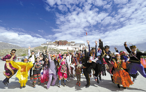 ▲各族青年在布达拉宫广场欢呼合影。