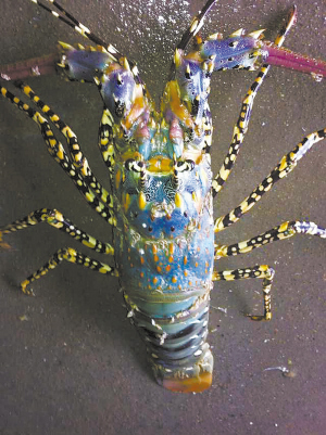 象山一渔民近日在渔山岛附近海域捕获一只色彩斑斓的“神虾”。这只龙虾个头很大,重约1.85公斤,身长55厘米,触角长102厘米。身体呈青绿色,触角和头部为深蓝色,四肢黑白相间,还有不少黄色斑点点缀其中。据老渔民介绍,这是“中华锦绣龙虾”,在舟山到温州一带海域很少见。