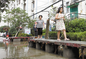昨天下午,在海曙区西门街道体育场路30弄9-12号老小区内,居民行走在刚搭建好的便桥上。为应对因大雨引起的低洼地段暂时积水状况,该街道在龙柏社区低洼地段修起一条长150米、宽0.6米的固定式混凝土便桥,既方便居民出行,也可供人们在平时作休闲纳凉之用。据悉,该街道还将在西湾路、新芝路等低洼地段逐步推广实施。(徐文杰 毛一波 摄)