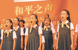 昨晚,由共青团宁波市委、市教育局、市文明办主办,市青少年宫承办的《和平之声》———宁波市青少年纪念中国人民抗日战争暨世界反法西斯战争胜利70周年主题唱诵活动在宁波音乐厅举行,市少儿合唱团、青年合唱团、知青合唱团等三个不同年龄层的合唱团首次同台,以合唱、朗诵,并配合情境表演、小提琴演奏等形式,让来到现场的青少年重温了那段烽火岁月。
