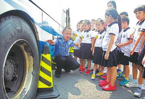 □本报记者 王晓峰 通讯员 石奇峰 俞科伟 昨天是开学首日,按照以往惯例,交警也在昨天送“交通安全”进学校。今年海曙交警的“开学交通安全第一课”别出心裁,通过现场实验互动的方式测算出了大型车辆的视觉盲区,告诉孩子们遇到大车时须保持一定的安全距离。 昨天上午,记者跟随海曙交警来到海曙外国语学校。这次交警给孩子们带来的“交通安全课”很有现场感,因为操场上停放着一辆长10米、宽2.5米的大巴车。随后,交警选取了一名身高为1.13米的男孩和一名身高为1.2米的女孩作为志愿者,进行大车盲区测试,然后由孩子们上车观看。 第一步测试,两名孩子先后站在左侧车头斜角处,也就是车辆左A柱对出去的地方。此时身高1.7米多的驾驶员在驾驶座上朝外观望。当孩子与车辆的直线距离有2.3米时,驾驶员才能看到孩子。 第二步测试,孩子站在车头正前方,在驾驶员不看“反光镜”的前提下,要距离1.2米的时候才能勉强看到人。 第三步测试是右侧车头斜角处,现场实验表明,由于受到右A柱遮挡影响以及孩子身高问题,驾驶员要在距离3.5米的地方才能看到孩子。 “这一点很值得家长重视,有些时候孩子候车靠得过近了,驾驶员又看不到,很容易引发交通事故。”交警说,大车除了前方存在视觉盲区,需要特别引起重视外,内轮差同样不容忽视。 出于安全性考虑,这次实验用警示筒代表行人。一排警示筒离大巴车的直线距离是3.5米,大车启动后开始转弯。记者发现驾驶员在精神集中、随时修正方向的前提下,内轮差未出现,右后轮距离第三个警示筒的距离为0.5米;但驾驶员转弯时精神未集中的状况下,直接把方向盘打死,那么右后轮就会碰到第二个警示筒。第二次实验把警示筒与大巴车的距离调整为2米。这次不管驾驶员有没有把方向盘打死,车辆都撞到了第三个警示筒。 “内轮差实验说明了两个问题:第一,驾驶员在驾驶时认真与否很重要,直接关系到事故的发生;第二,行人要和大车保持安全距离,3.5米以内都有可能发生危险。”交警说。