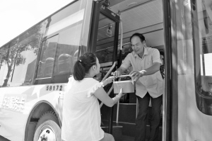 | 374路班组长张国辉接过保温盒。 通讯员 董美巧 摄 |