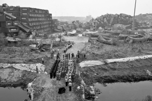 | 18日,救援部队、武警、公安在事故现场默哀悼念遇难者。 |