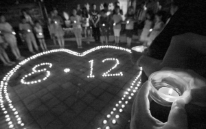 | 18日晚,天津市和平区天新里社区的居民点起蜡烛悼念逝者。 |