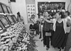 | 18日,事故中牺牲的消防战士亲属在天津市公安消防开发支队临时灵堂内悼念。 |