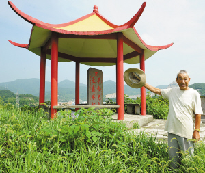 | 翁全芳老人在烈士碑前介绍70多年前的往事。 记者 龚国荣 摄 |
