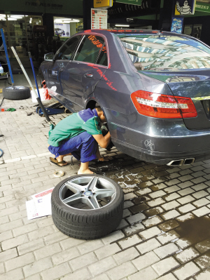 | 消费者在市区一家轮胎店更换轮胎。记者 唐严 摄 |
