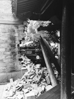 据了解,事故发生在昨天下午3点左右。租用庆安会馆的某公司员工向记者介绍说,当时就听到会馆围墙发出巨大声响,跑出去一看,围墙被撞了一个大洞,除了木柱外,还有一扇边门被撞倒。