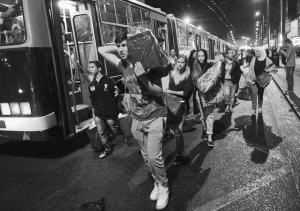 | 9月5日凌晨,在匈牙利布达佩斯,难民们找寻前往匈奥边境过境点海吉什豪洛姆的公共汽车。 新华社发 |