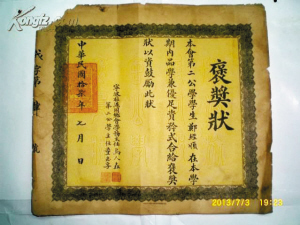 | 宁波旅沪同乡会第二小学1928年《褒奖状》 |