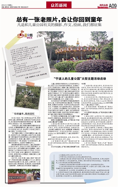 本报讯(记者 钟婷婷 通讯员 袁洁)市儿童公园历经近40年的城市变迁,承载几代人的童年回忆。为切实提升新儿童公园建设水平,充分吸纳广大市民意见,尤其是孩子们的想法,“宁波人的儿童公园”大型主题活动应运而生。 本次活动由宁波市文明办、宁波市住建局、宁波市教育局、共青团宁波市委 、宁波市妇女联合会共同主办,宁波晚报、现代金报联合承办。自2019年12月中旬起,我们向全市人民征集有关市儿童公园的老照片,并举办面向青少年儿童的主题作文、绘画作品比赛。 一个多月来,活动组委会收到约100张市儿童公园照片,这些照片中,有三四十年前在月湖旧址拍摄的,有千禧年后在兴宁路旁的儿童公园留影的。雷锋纪念碑、大象滑滑梯、12生肖小铜像、大苹果、奥特曼……看了大家发过来的老照片,我们才知道,原来这些都是当年儿童公园的“网红地标”。 回忆尤珍贵,未来更可期。大家在追忆过往的同时,也开始和孩子们一起描绘新儿童公园的样子。“儿童公园是孩子们观察、探索和学习的好去处。希望新儿童公园在设计上,能吸纳博物馆式的知识性,和游乐园式的娱乐性。充分调动孩子的求知欲,激发孩子的参与热情。”海曙中心小学505班涂君健家长说。活动发起后,海曙中心小学、鄞州蓝青小学、鄞州区堇山小学等学校的学生热烈讨论,和老师、家长共同畅想着新儿童公园的建设。其中,部分学校的学生参与人数达上百人。 据统计,本次活动有591幅绘画作品、415篇主题作文、约100张照片进入初审。为科学公正开展本次活动的评选工作,组委会通过专家研讨会、公众投票、盲选等方式进行。 今天,获奖名单正式出炉。这份获奖名单中的作品,希望能给新儿童公园的建设带来一点帮助,给设计师们带来一些灵感。这也是举办本次活动的初衷和意义。
